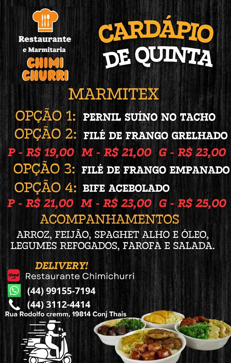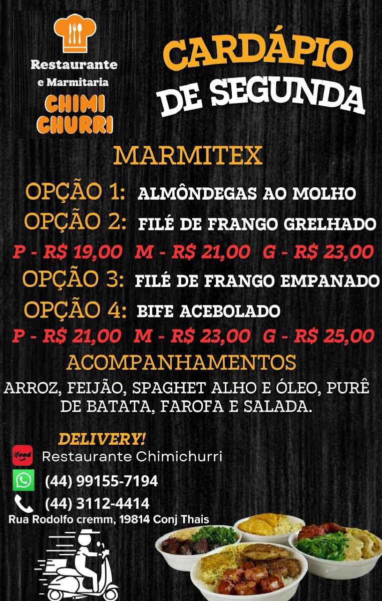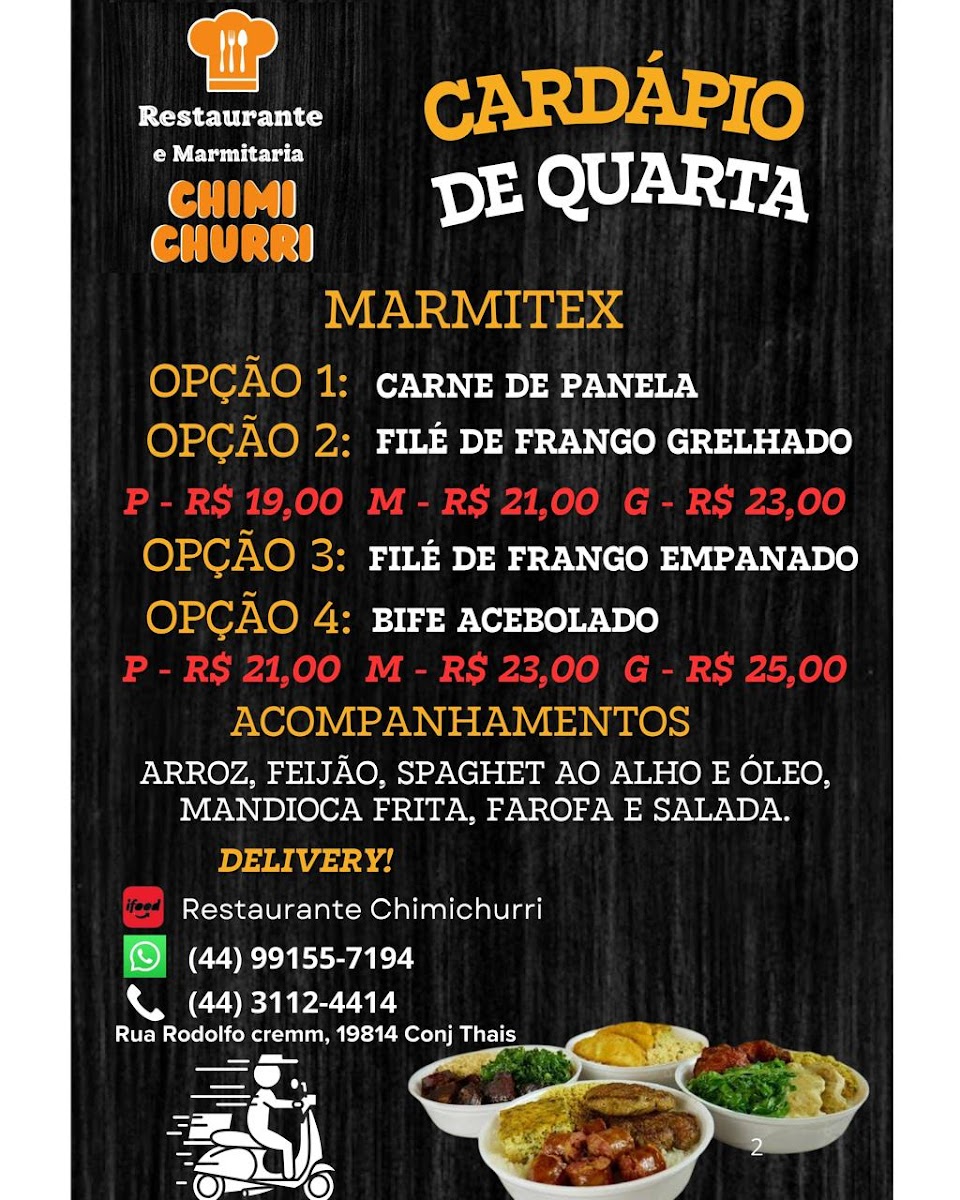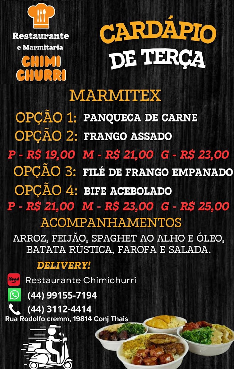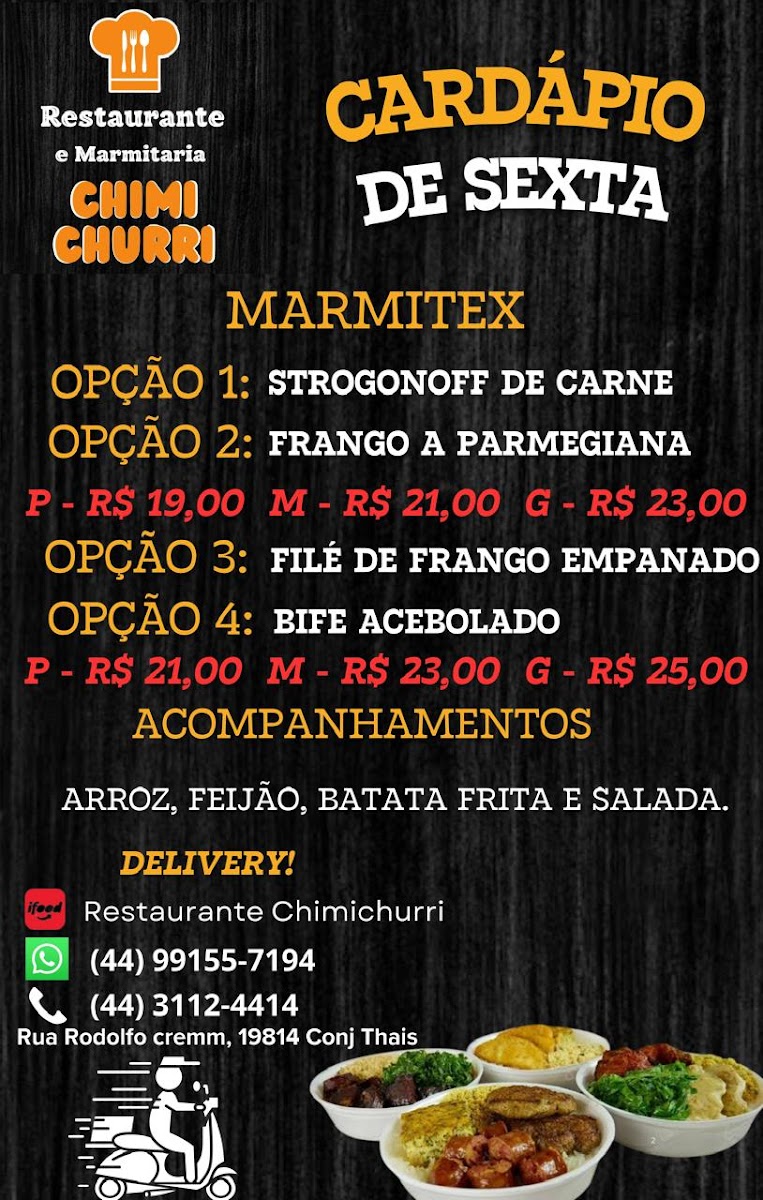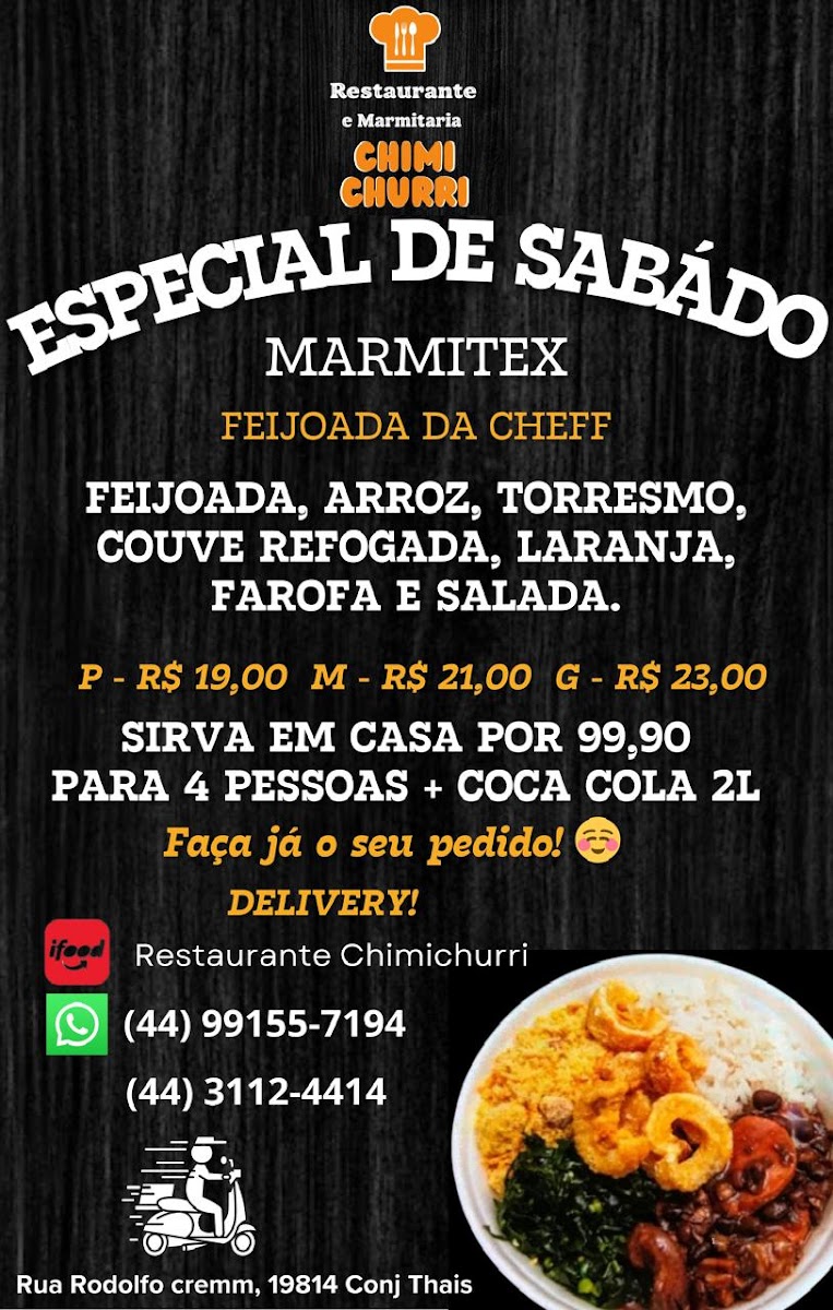 Restaurante e Marmitaria Chimichurri in Maringá, Brazil, stands out for its authentic, home-style dishes that captivate with rich, precise seasoning and generous portions. This cozy eatery, praised for impeccable service and quick delivery, has earned consistent five-star reviews from loyal patrons like Kauana and Natalia. The menu showcases hearty meals that blend tradition with comfort, perfect for those seeking nourishing, flavorful marmitas that feel like a warm embrace.